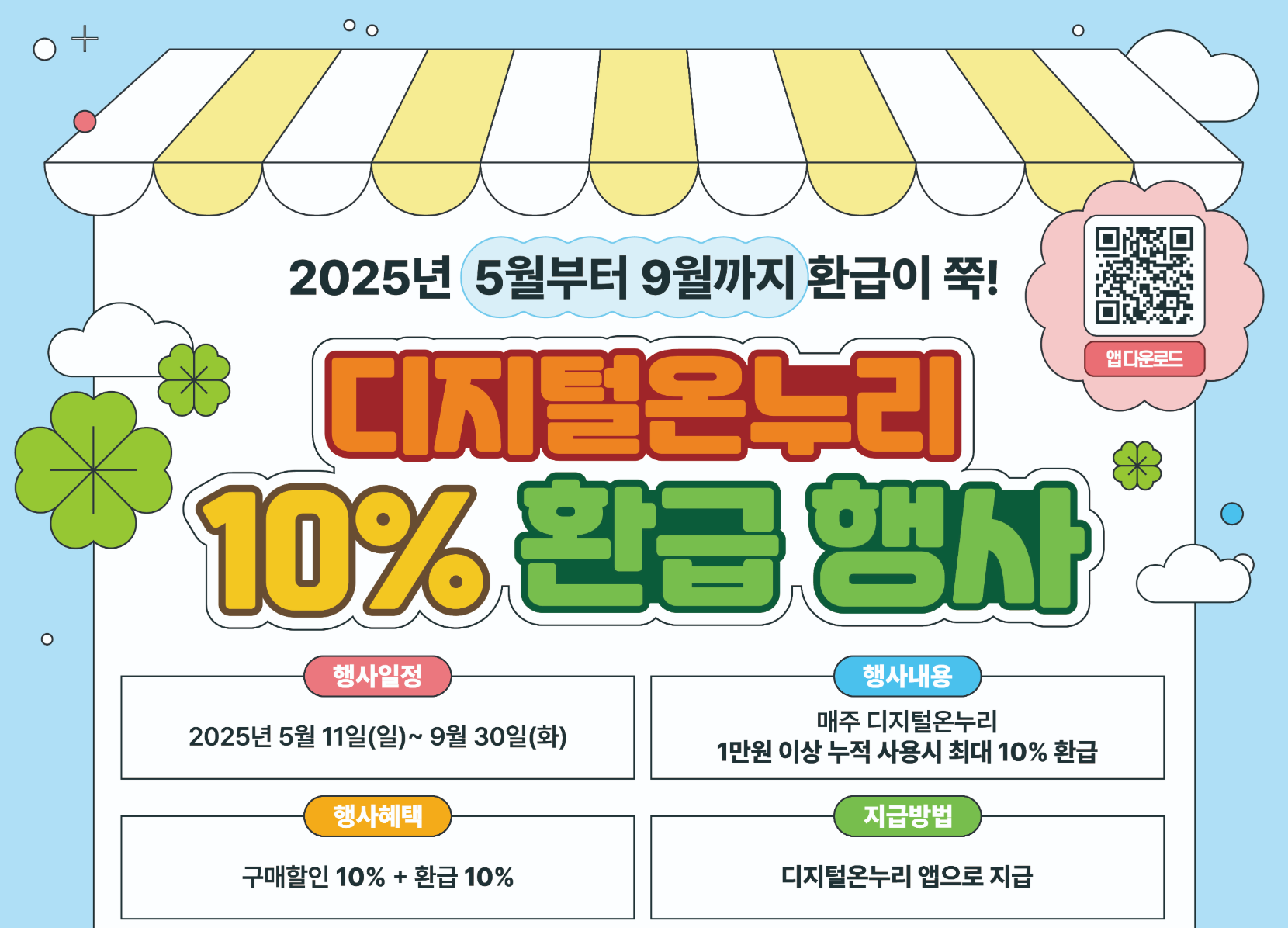전통시장과 소상공인을 위한 착한 소비, 디지털 온누리상품권이 2025년 여름, 더 알찬 혜택으로 돌아왔습니다. 5월 11일부터 9월 30일까지, 온누리상품권을 사용하는 소비자에게 결제금액의 10% 환급, 매주 최대 2만원까지 돌려주는 특별 이벤트가 진행 중인데요! 매주 알뜰하게 돌려받고 싶다면 지금부터 아래 꿀팁을 확인하세요!
