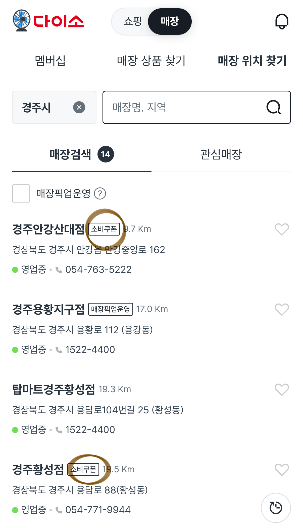 다이소 앱 또는 홈페이지 매장정보에서 지역을 검색하면 소비쿠폰 쓸 수 있는 곳은 매장이름 옆에 [소비쿠폰] 이라고 표시되어 있습니다.