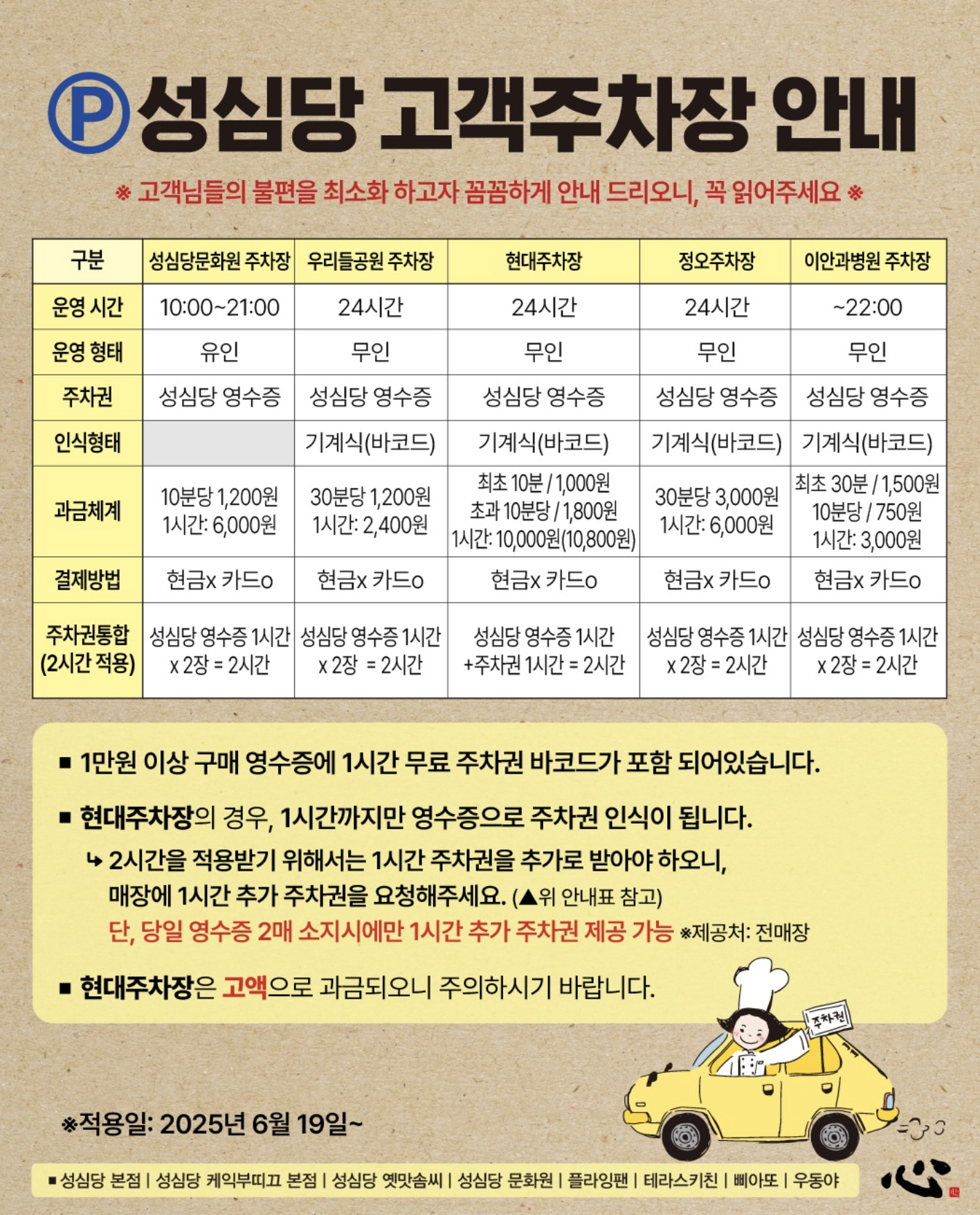 - 주차 : 성심당 본점 주차장과 동일한 곳에 주차하면 됩니다. 성심당 고객주차장, 현대주차장, 이안과병원 주차장, 우리들 공원 주차장 등이 있으며, 1만원 이상 구매 시 주차권을 요청해야 합니다. 우리들 공원 주차장이 가장 저렴하다고 추천됩니다.