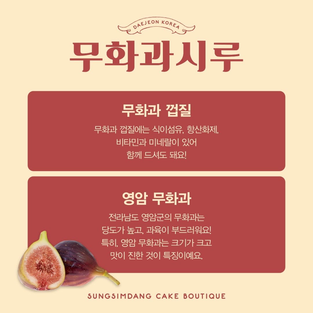 - 예약 불가 : 무화과 시루 케이크는 예약이 불가능하며, 매장 현장 구매만 가능합니다.