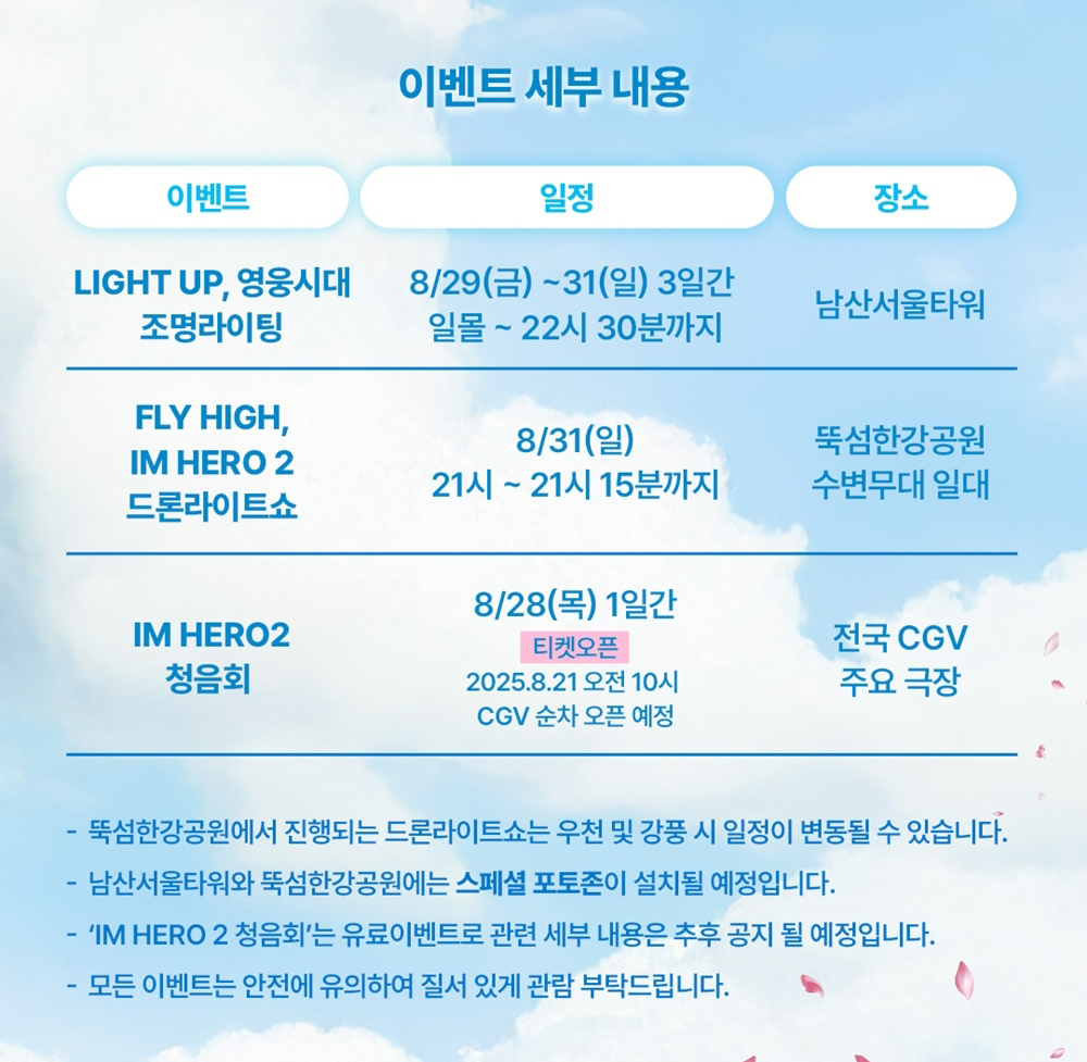가수 임영웅이 드디어 팬들과의 약속을 지켰습니다. 정규 2집 ‘IM HERO 2’ 발매를 기념해 준비된 특별한 컴백 이벤트가 청음회, 남산 조명 라이팅, 뚝섬 드론 라이트쇼까지 이어지며 팬들의 기대를 모으고 있는데요. 이벤트 일정과 장소, 관람 포인트를 한눈에 정리해드리겠습니다.