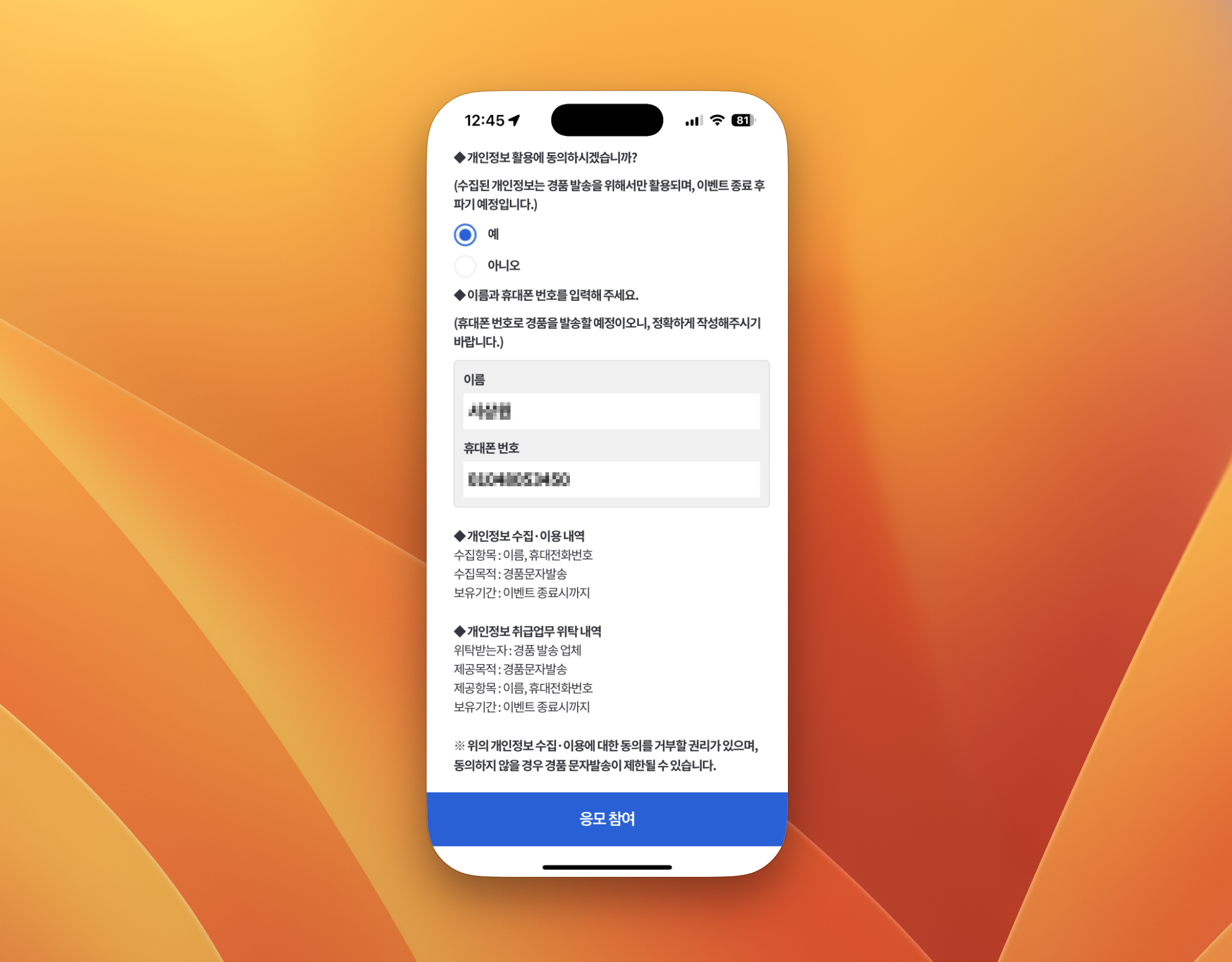 - 마지막 부분에 경품 응모에 체크 및 개인정보 동의 → 완료
